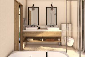Designer bathrooms with furniture, mirrors and walk in showers