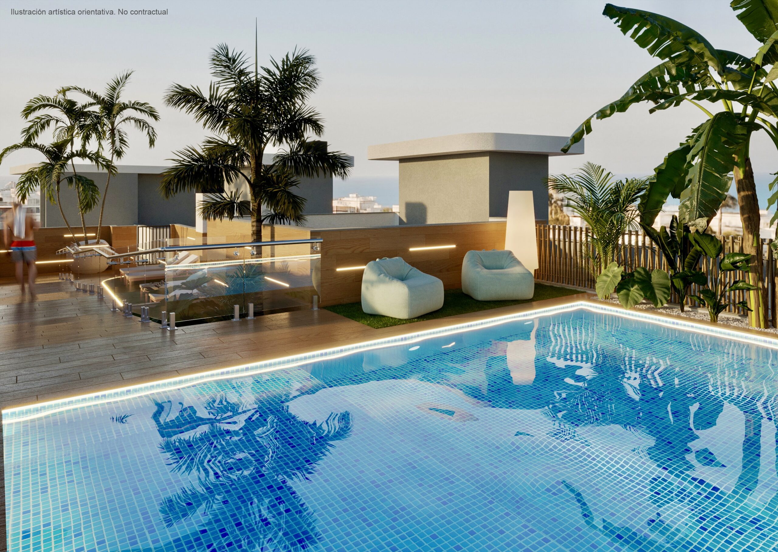 The residence offers a communal swimming pool and rooftop solarium — ideal for enjoying the Spanish sun and the relaxed Mediterranean lifestyle.