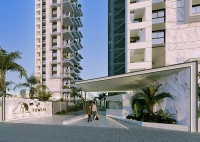 The elegant towers — sleek, luminous, and open to the horizon — house spacious apartments with pure lines, panoramic terraces, and floor-to-ceiling windows framing magnificent views of the sea, lagoon, and surrounding mountains.