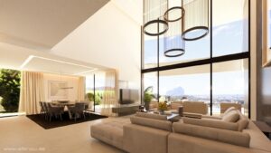 This villa offers 335 m² of luxurious living space on a generous 1,042 m² plot, with spectacular views of the sea, the Peñón de Ifach, and the town of Calpe. With three thoughtfully designed floors connected by an interior staircase and elevator, this villa provides style and convenience at every level.