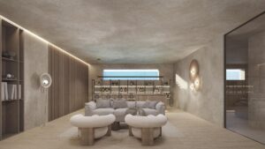Finally, in the basement, there is a large leisure space, games room, TV and bar and a gym room. Both rooms are flooded by the light that enters through the openings in the swimming pool and through which the light enters, filtered by the brightness of the water.