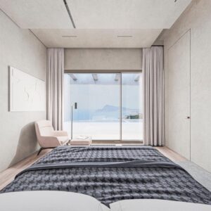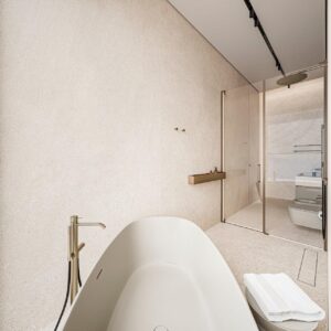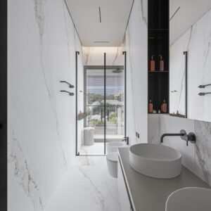 The property offers four spacious bedrooms with en suite bathrooms, each designed as a private retreat with high quality finishes and direct access to terraces. The master suite stands out for its walk in wardrobe and luxurious bathroom with a freestanding bathtub overlooking the sea, creating a truly relaxing atmosphere inspired by luxury spa environments.